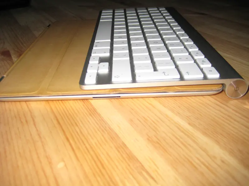 The keyboard's battery cylinder rests just along side of the iPad while in the leather Satchel in this photo