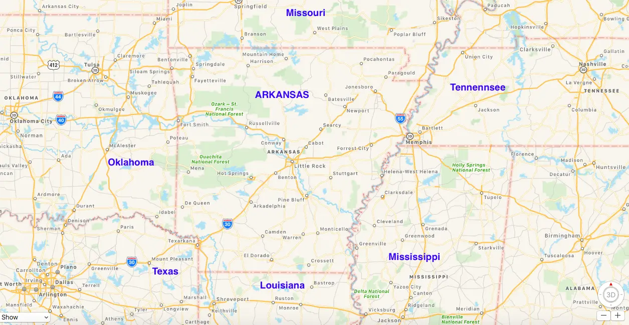 In looking at the location of Arkansas on the map below, the state is surrounded by others, such as Mississippi, Tennessee, and Louisiana, which were seminal in the development numerous musical genres unique to the United States - early, ragtime, blues, jazz, & gospel, then country, mountain/bluegrass, rockabilly, R&B, and Rock & Roll - Arkansas has contributed substantially to this Musical Heritage. On my visit to the gift shop of the Old State House, I purchased the book 'Our Own Sweet Sounds' shown below, which is a brief read by Robert Cochran, who has put on two exhibits of 'A Celebration of Popular Music in Arkansas' at the state house.