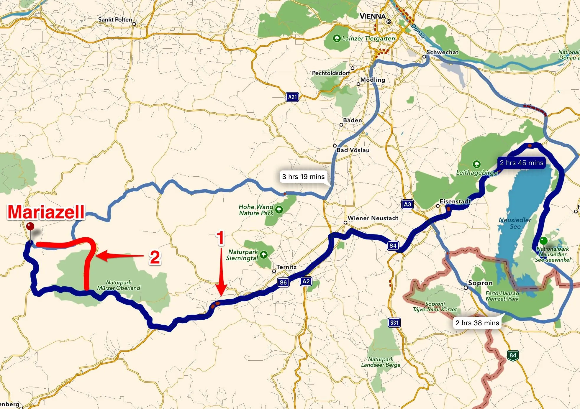 The bold blue line shows my route, except for the last part, where I was driving the roads marked by the red line.
