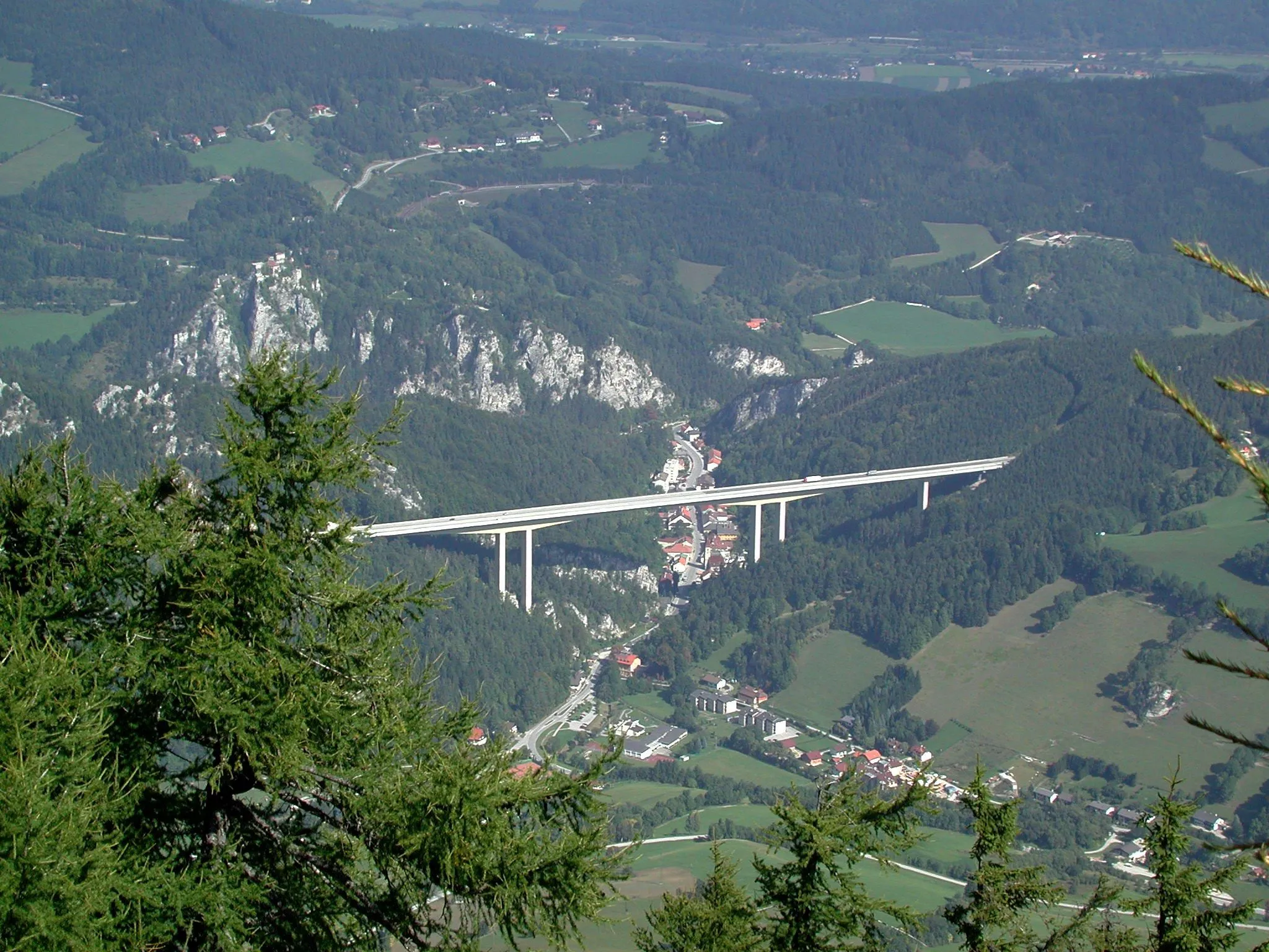 The bridge itself is made of concrete, 250 metres long, connects two tunnels, and the road is 130 metres above the ground, above a municipality called Schottwien. That's also the reason why it's called the "Schottwien Bridge", or "Talbrücke Schottwien" in German - it crosses a valley near Semmering. It was built from 1986 to 1989.