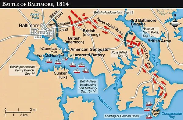 Ft. McHenry is most famous for defending Baltimore in the War of 1812 - the British planned a combined land and sea attack to take the city (see battle map below); the land attempt was repulsed and the naval bombardment a failure - the British did not want to move their ships close to Ft. McHenry in fear of the guns and 'hot shot', so they simply left and Baltimore was saved. Francis Scott Key, a lawyer, was aboard a ship and on the morning of September 14, 1814, saw the newly raised garrison flag (15 stars & 15 stripes) still standing, and inspiring the words that became 'The Star Spangled Banner', the USA's national anthem - see quotes below and link for more information.