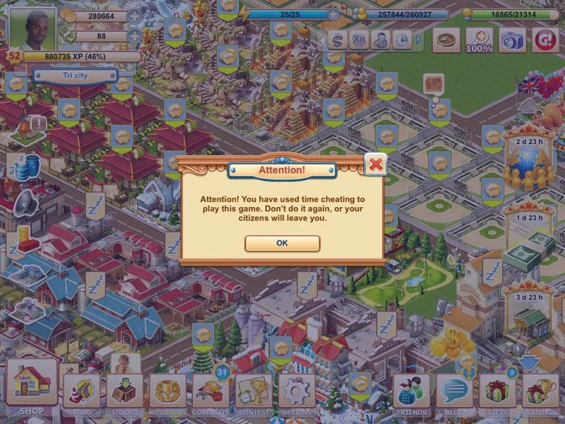 Got a message yesterday warning me not to cheat by changing the time. They say if I do it again all my people will run away, whatever that means. The fact is I have not cheated. I didn't fly to a different time zone.