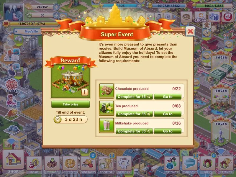 you should be glad it's that low. Helps if you have 5 mini buses running all the time.Once again, some absurd numbers for such a short event. Unless you have a whole bunch of bananas saved up, how in the world can they expect us to make that many milkshakes in 4 days?! Not to mention the chocolates which require a 6 hour cacao bean each. I can understand stretch goals but these are just flat out unattainable unless you spend every waking hour playing the game/spend real cash. On another note, I think its totally unfair that the numbers vary from player to player (I guess based on your level). I have the following requirements: Chocolate: 9 Tea: 35 Milkshake: 22 The time and ingredient requirements are the same so why such a huge discrepancy?!