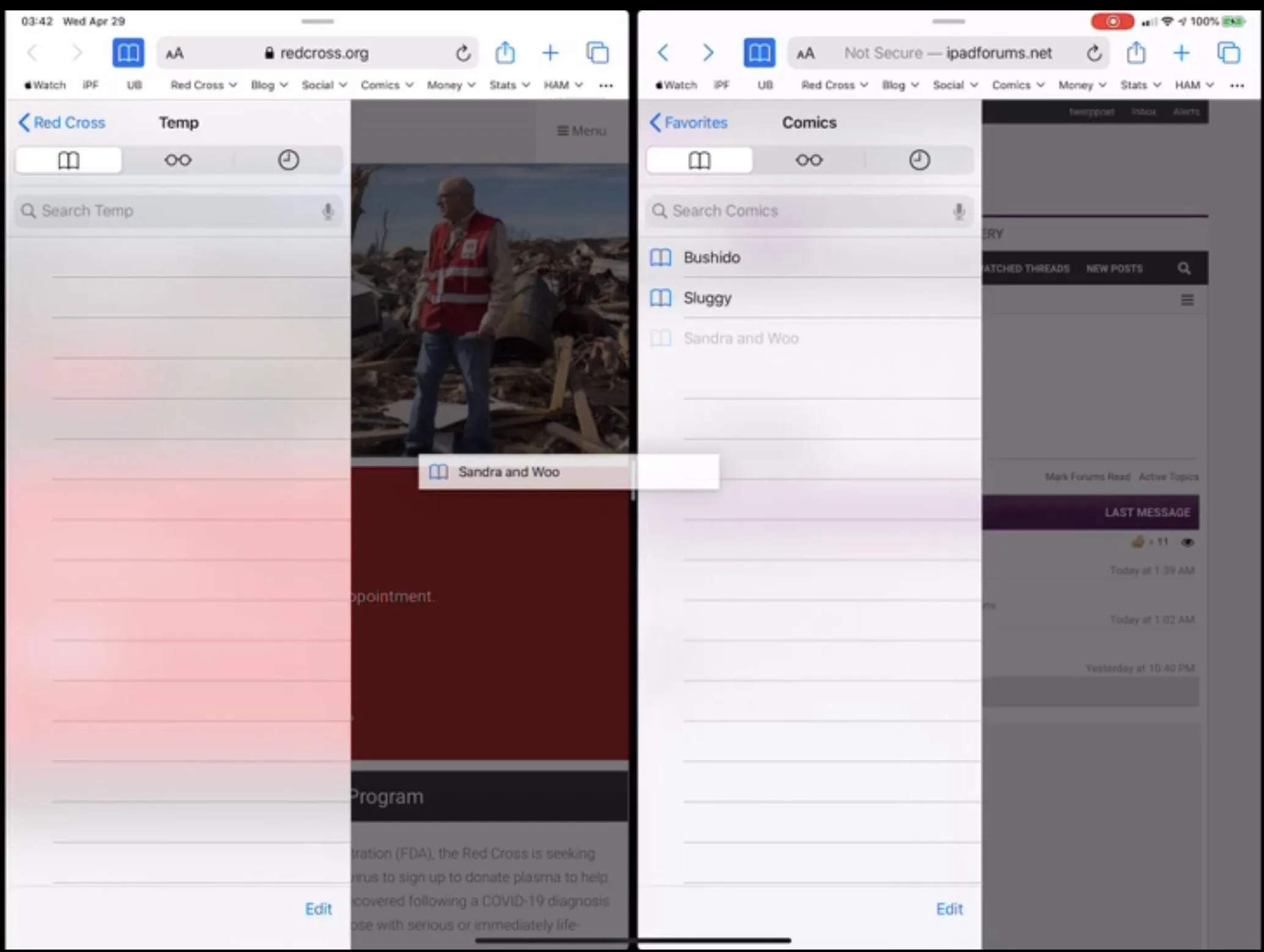 Here’s a trick that helps a bit. If you open two views of Safari side by side, you can open different bookmark folders in each pane and drag bookmarks between them. Be careful to drop the bookmark on an empty part of the list, or you may accidentally replace the destination Safari pane with the bookmarked site, or open the bookmark in slide-over.