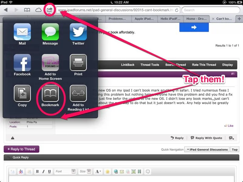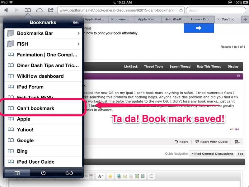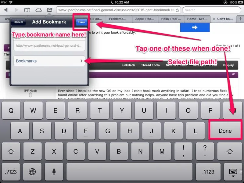 Ever since I installed the new OS on my ipad I can't book mark anything in safari. I tried numerous fixes I found online after searching this problem but nothing helps. Anyone have this problem and did you find a fix for it. Everything worked just fine befor the update to the new OS. I didn't lose any book marks,,just can't add any and yes, I know about the new way to do that but it just doesn't work. Any help would be greatly appreciated,,,thanks in advance. Forgot to mention,,its the new ipad