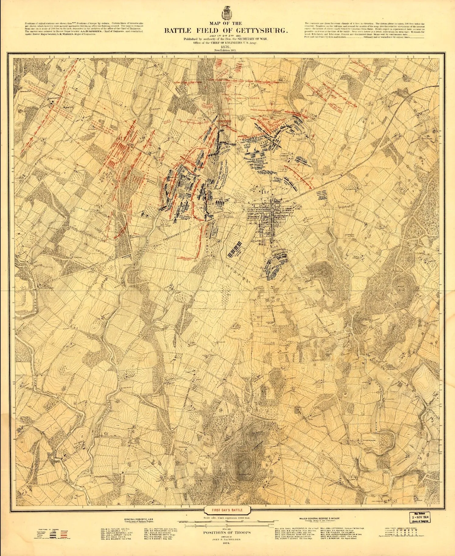 The first map below is my attempt to add lines to a beautiful map showing 'roughly' the actions that happened on each day; the first day's fighting started unintentionally north and west of the town of Gettysburg (top middle on the map) - my white arrow shows that general location (refer to the more detail map for a better appreciation of the action). On the second day (next post), much of the activity occurred where I've placed the red lines, and most importantly at the bottom around