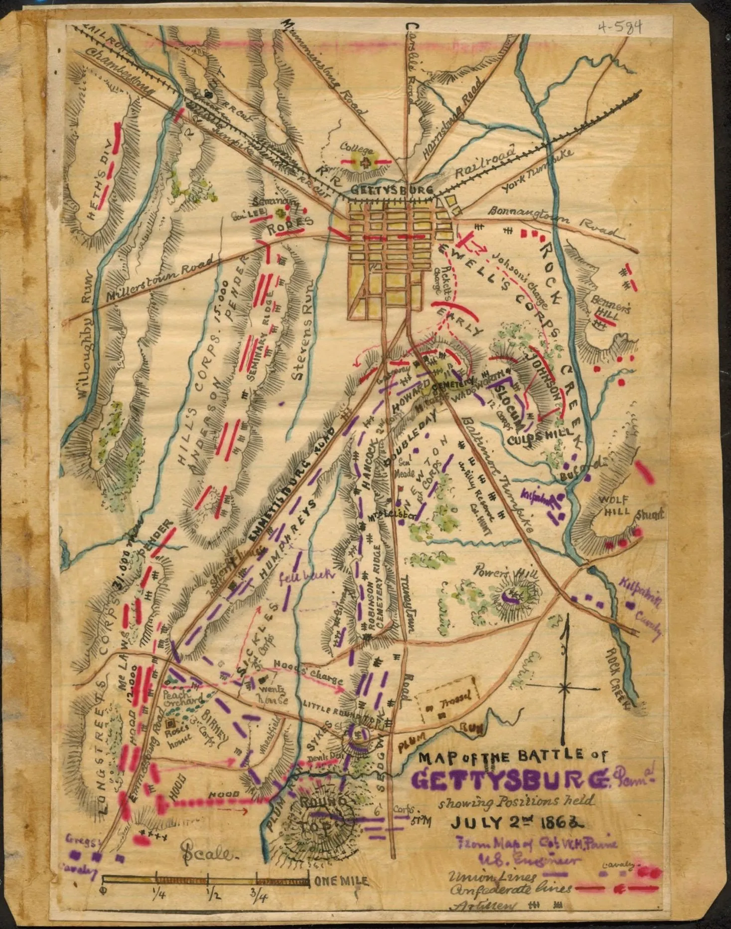 Little Round Top. The third day (blue lines), had the Confederates placed on