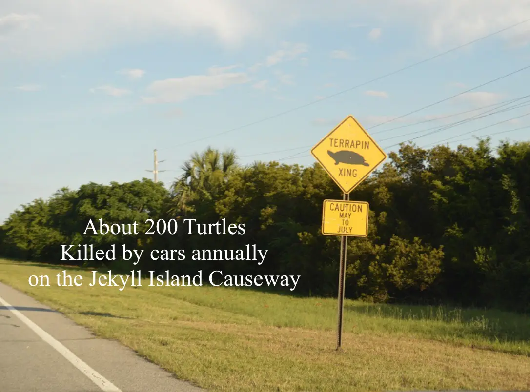 The Georgia Sea Turtle Center which opened nearly 10 years ago is dedicated to the education, treatment, and rehabilitation of a variety of sea turtles (five species in Georgia - see quote below). Road signs like the one below caution motorists to look for turtles and about 200 or so are killed annually just on the Jekyll Island causeway.