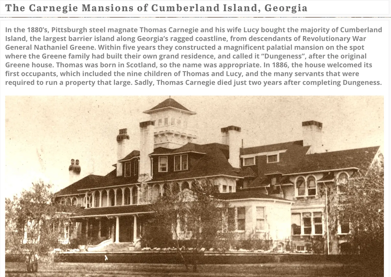 In the late 19th century, the Carnegie family bought much of the island from the Greene heirs and built a mansion called