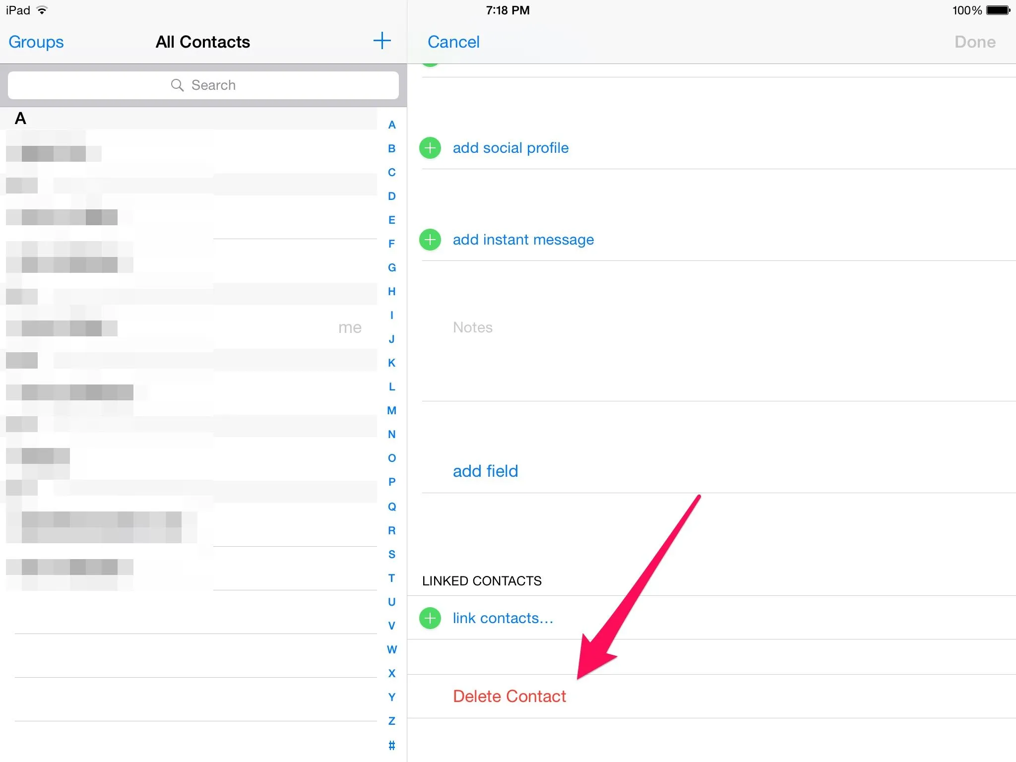 Select the contact you want to delete, then tap the edit button and scroll all the way to the bottom of the page and tap the "Delete Contact" button.View attachment 64538