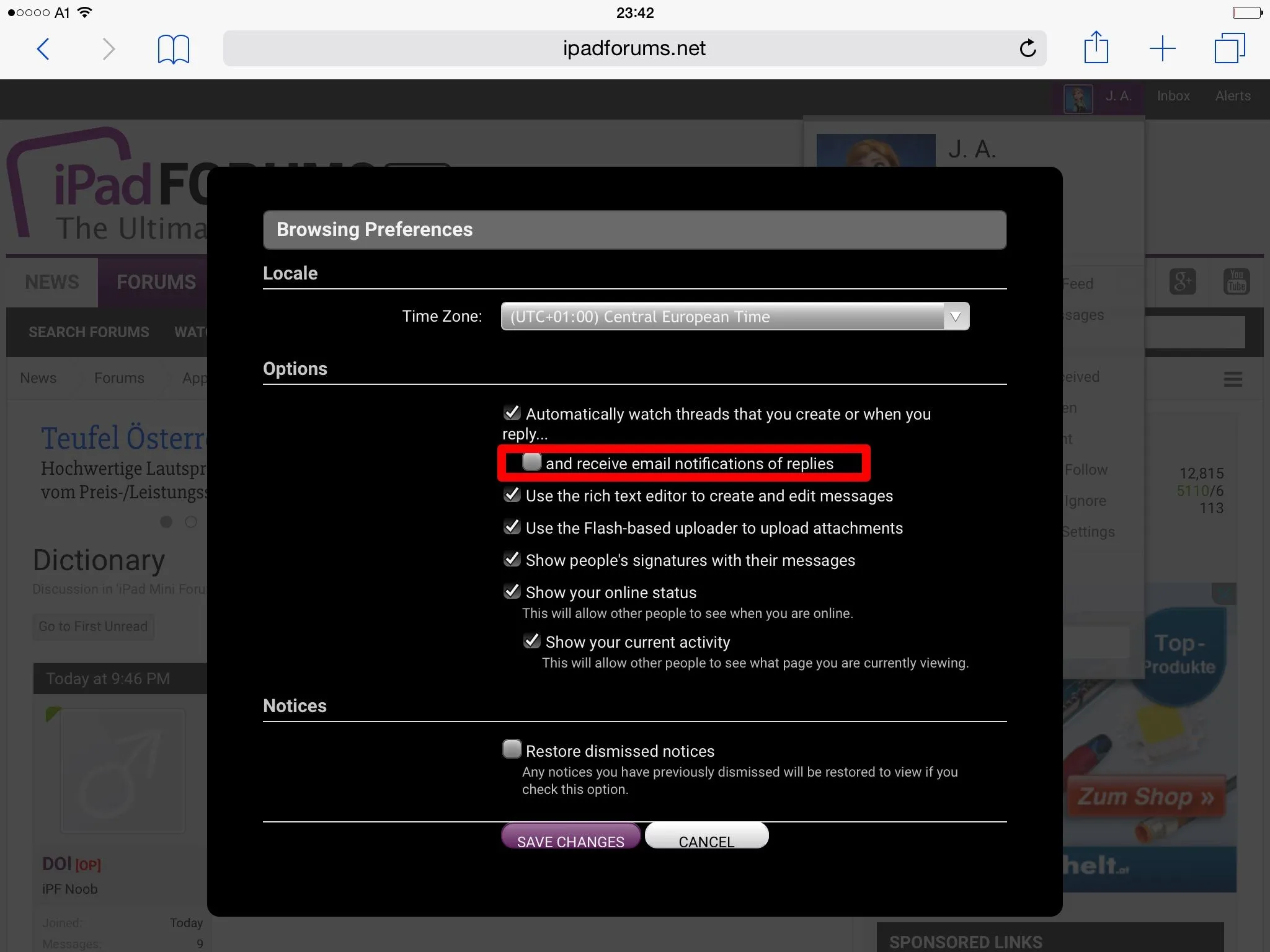 If you're using Safari to access this forum, tap your username at the top right. A menu will pop up. Select "Preferences" there. One of these will be "... and receive email notifications of replies". You'll see a checkmark next to it. Tap it to disable it:And how do I turn off the notifications so that I don't keep getting e-mails from the forum?