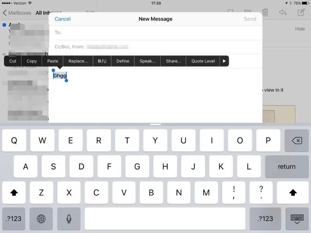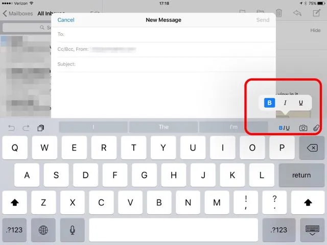 You can also select text, then tap on it for the contextual menu, where you will see the BIU controls if applicable. The body of the email is the only place where you will see BIU controls.