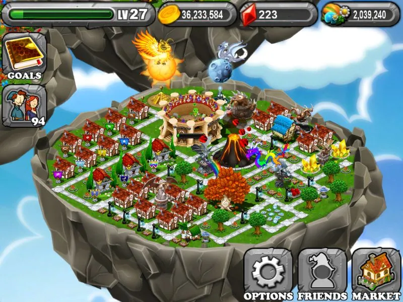 Draconia city has become very touristic lately. Originally the home of the dragon tamers, many wizards have decided to make Draconia city their home. After all, it is the perfect place to learn about dragon lore, either from observation or from the dragon keepers (if you can get a hold of them, they are very busy!). The city expresses it's grandeur with their mascots, the rare sun, moon and rainbow dragons.