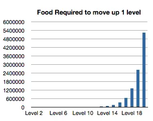 Working it out is actually much simpler than listing of the numbers I did. Because it doubles every level, you can work out total food required to get to any level by doubling the amount it costs to jump the last level and subtract the cost of moving from level 1 to 2. So in this case it's twice what it costs to go from level 14 to level 15, minus the cost of going from level 1 to level 2. Or (163 840 X 2) - 20 = 327 660.