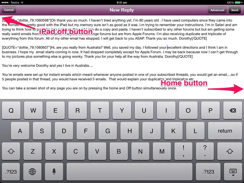 Oh thank you so much. I haven't tried anything yet. I'm 80 years old . I have used computers since they came into the homes. I'm pretty good with the iPad but my memory sure isn't as good as it was. I.m trying to remember your instructions. I'm in Safari and am trying to think how to print the info out. Just thought I can do a copy and paste. I haven't subscribed to any other forums but but am getting some really weird emails from other forums. They are from strange forums but are from Apple Forums. I'm also receiving duplicate and triplicate of everything from this forum. All of my other email has stopped. I will get back to you ASAP. Thank you so much. Dorothy