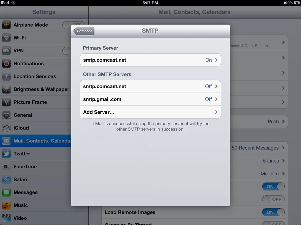 I have tried entering the same password in both primary and other outgoing SMTP servers, but I still get the same message. It is not allowing me to turn off the other SMTP server, as when I turn it off and press done, it is still showing as on.