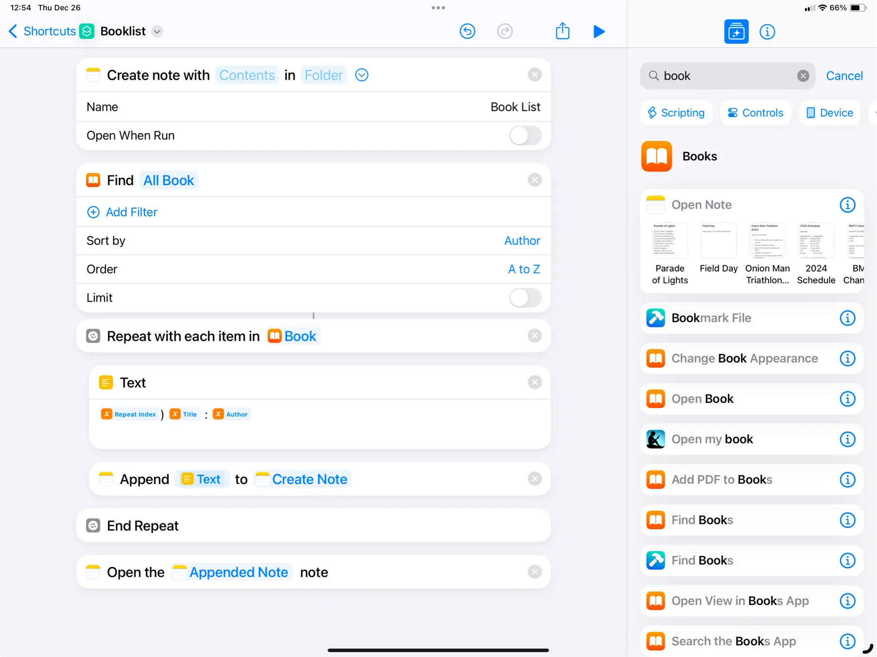 It saves a list of titles and authors to a note, then opens the note for you. You can tweak it in the text step to add more information, and do some basic formating. I have over 500 books, and it took a couple of minutes to run on my M2 iPad Pro. So, this s pretty slow for very large collections.
