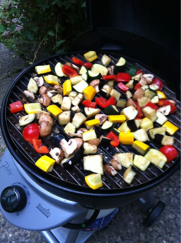 Eggplant, yellow and green zucchini are on as well. I bet we could grill some orange too.