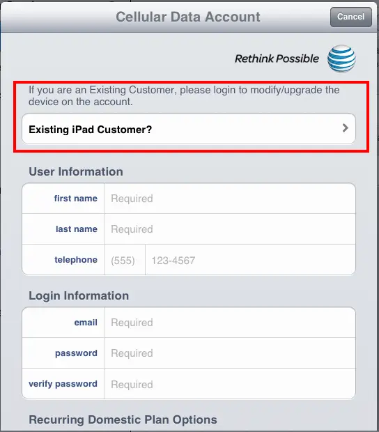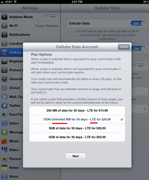 You will then be prompted to log into your ATT iPad account. Login with the info for your current account and magically your new 4G iPad will be the device active under your Unlimited Data Plan.