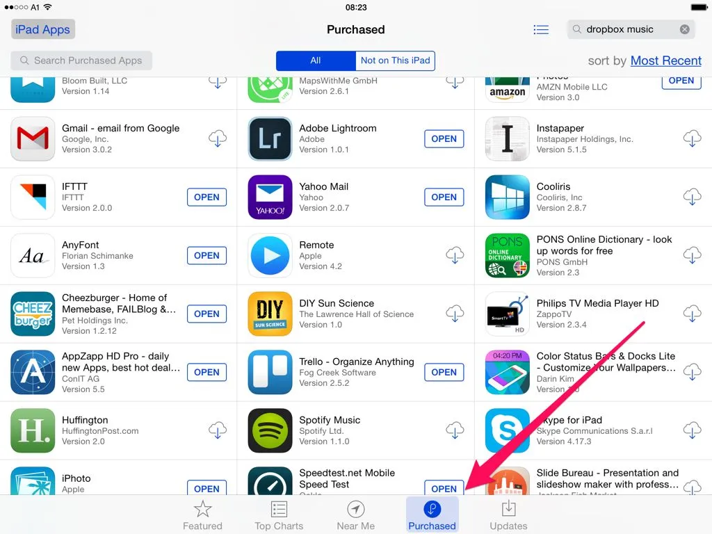 Here you'll find all the apps you purchased before with this ID. The ones with a cloud next to them are not installed on your iPad. When you tap the cloud symbol, the app will start downloading and installing on your iPad.