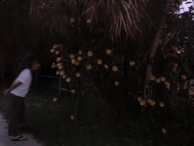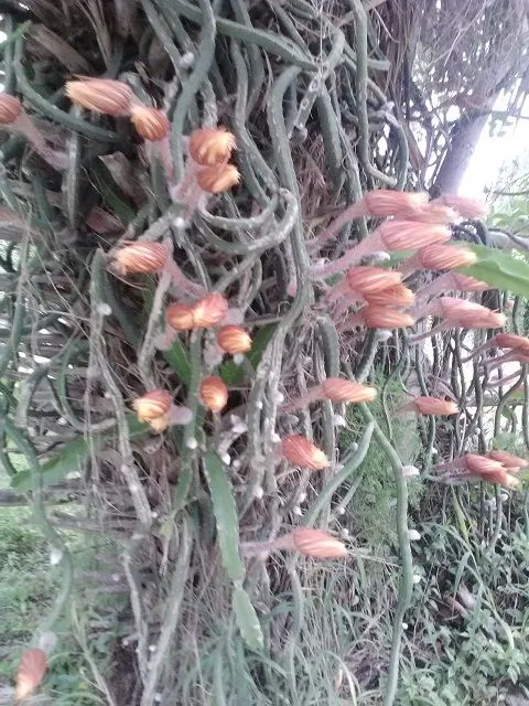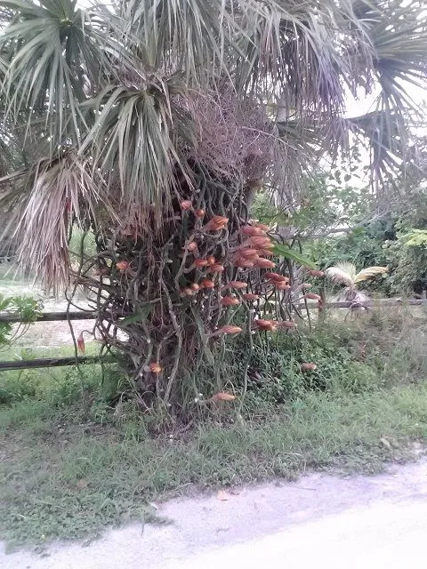 Here is a picture of one of our Sabal Palm trees. The cactus climbs up the tree and the large buds are about to open