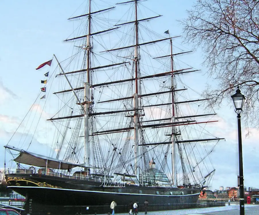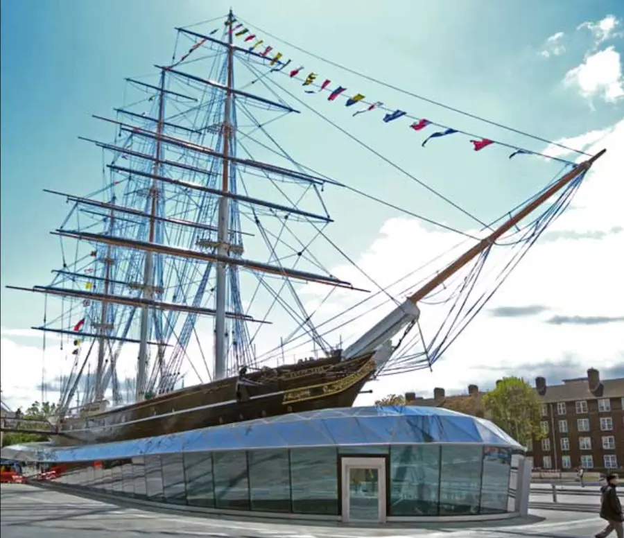 The Cutty Sark recently completed a multi million Pound restoration, after having been almost destroyed by fire in 2007. The original iron frames were no longer strong enough to support the weight of the ship and much internal bracing had to be done. The grey steel parts between the white original frames are the bracing added to the hull during the restoration after the fire. The ship is now suspended above the dry dock, with exhibit space below the hull. Here are some other photos.Scifan.. - I've visited the Cutty Sark a couple of times and was just looking at some photos on the web - the first one below is from 2005 and the second recently where the ship seems to be sitting on a glass building - I'm assuming that is a museum which was built since my visits (which where in the last century -) - Dave