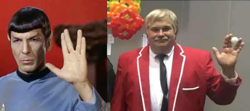 Leonard Nimoy (1931-2015) introduced the Vulcan Hand Sign which apparently was part of his Jewish heritage - but many cannot spontaneously arrange their fingers to create the sign - likely a genetic trait in how one's hand/finger muscles work together - I cannot make the sign (nor can I wiggle my ears!) - NOW, looking at the pic posted by Scifan.., Captain Kangaroo likely cannot make the sign but needs a ping pong ball to 'simulate' the position - Dave