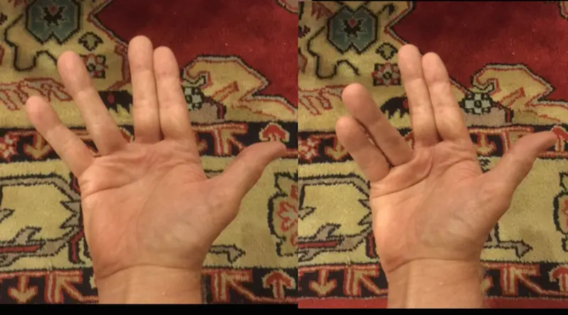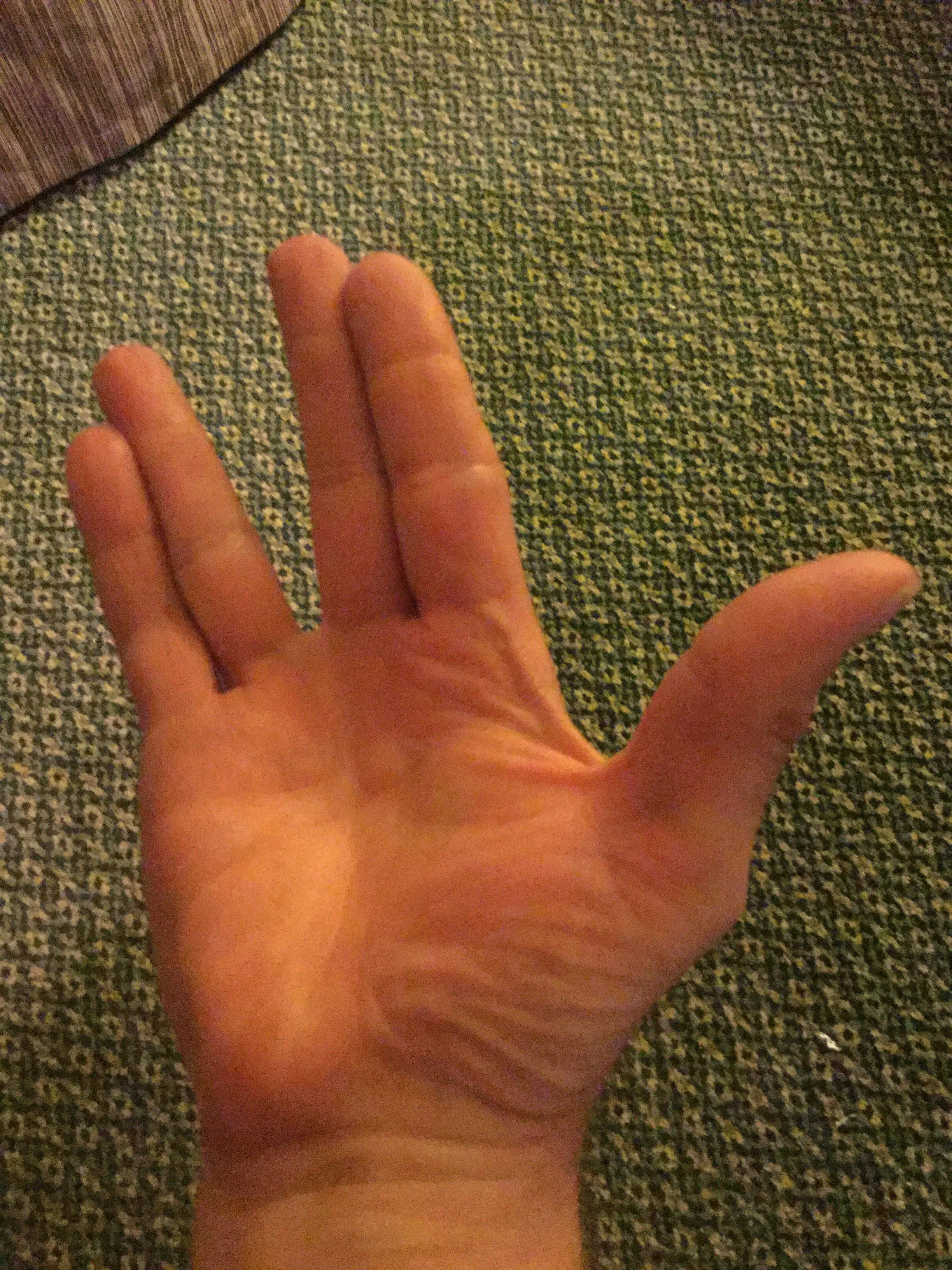 Just to show my hand below - first image (left) w/ fingers stretched and unable to assume the position, but if I bend my 4th & 5th fingers (right), then the two come together - but, let me ask - can you 'wiggle' your ears?Dave