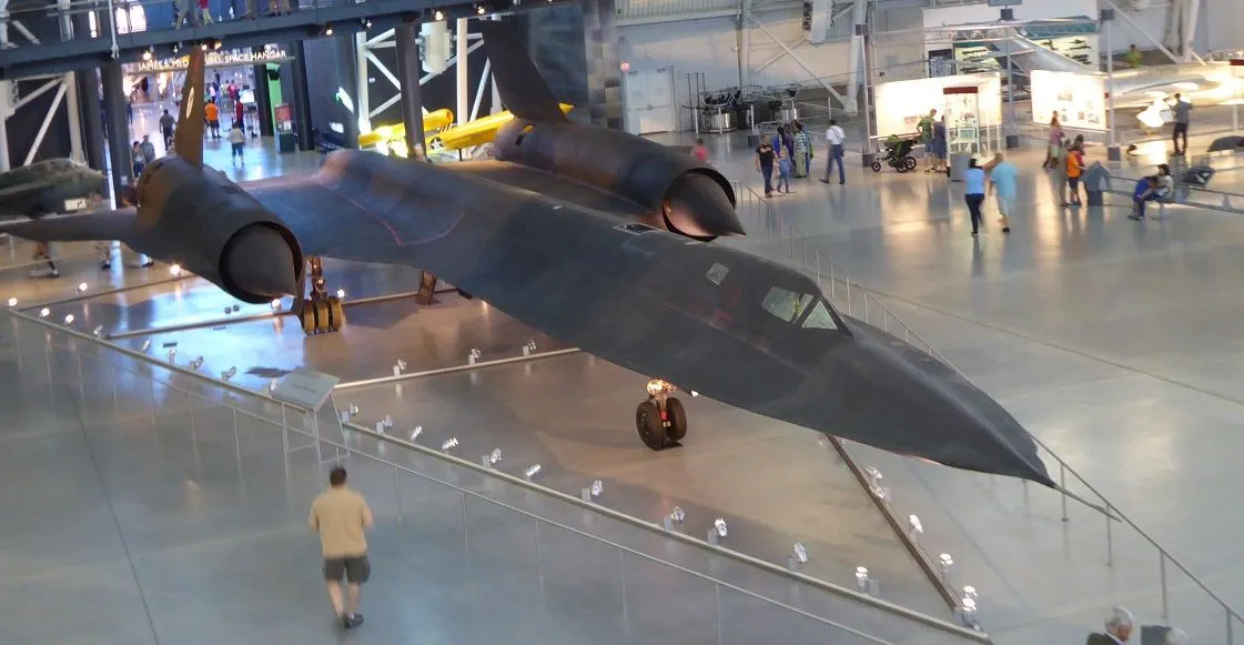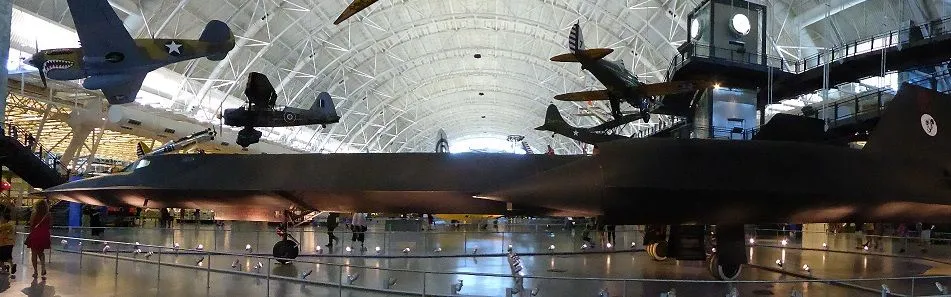 This is the Lockheed SR-71 Blackbird plane. Built as a replacement for the U-2 it is the fastest air breathing plane ever built. Two men in the cockpit, the rest is fuel. It's faster than anti-aircraft missiles - if one is launched, it just outruns it. Sustained speeds of over Mach 3.2. At 80,000 ft (24,000 m) the photos are good enough to measure the white lines in an automobile parking lot (the docent showed pictures - amazing). It was replaced by spy satellites in 1999. It is the first plane built with 'stealth' design. The function may be controversial, but I think the technology is amazing and the plane is beautiful. This was taken at the Smithsonian Air & Space annex at Dulles Airport.