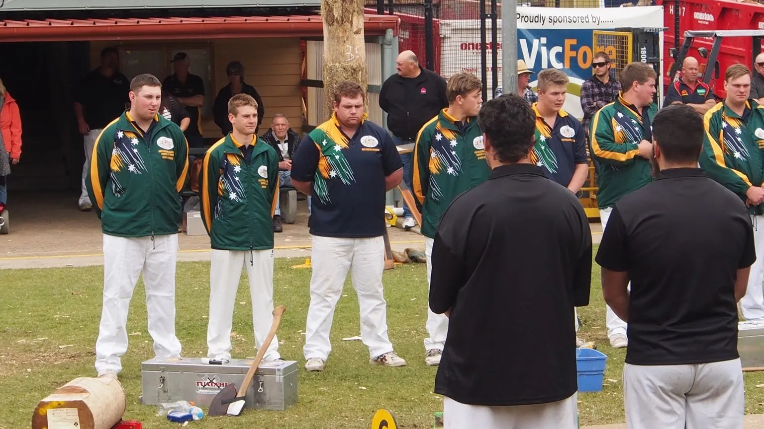 A highlight of any show visit is the wood chopping contests. Yesterday was part of an international competition between Australia (in green and gold) and New Zealand (black and white) in a series of medleys in chopping and sawing.