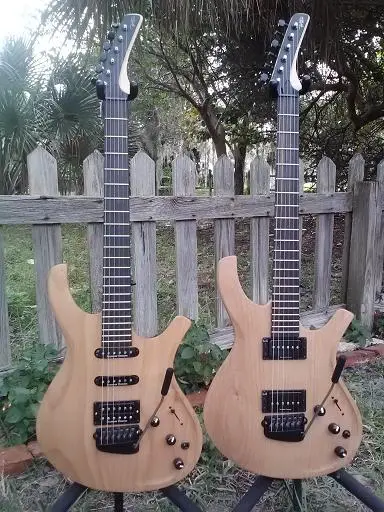 The one on the left is stock, the one on the right is custom made for me. The pickups can be switched to P90, Rail, Series Humbucker or Parallel Humbucker. Along with the Piezo they have a very wide variety of sounds and can sound like 4 or 5 different guitars plus (so I only have to take one to the gig, along with the sax, flute and wind synthesizer).