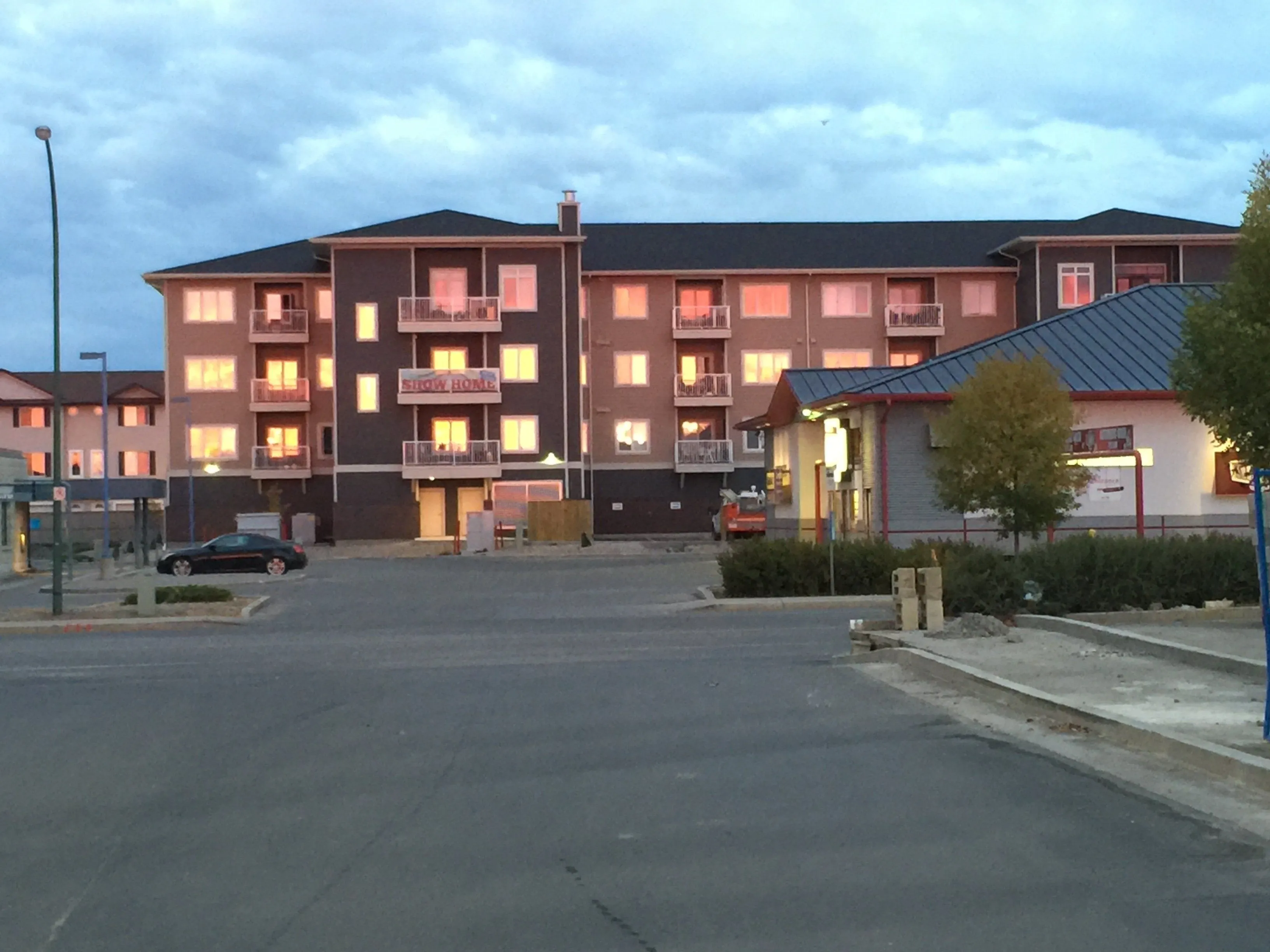 The sunrise reflected in condo windows a cross the street from my workplace.