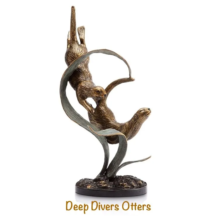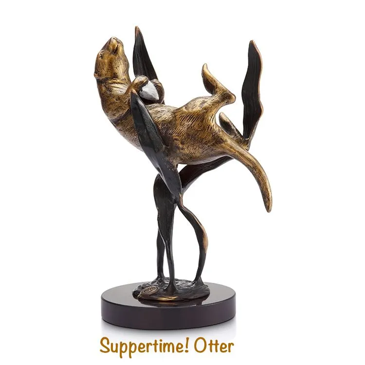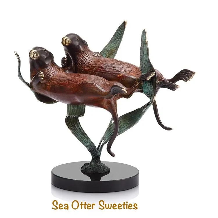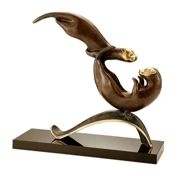 SPI Gallery, Balancing Act Sea Otters in brass and set on a highly polished rectangular marble base. Approximately 11'"h x 11"w x 4"d. Two sea otters playing gracefully without a care in the world. The mystery of the sea and fine brass sculptures have long been the hallmark of SPI.