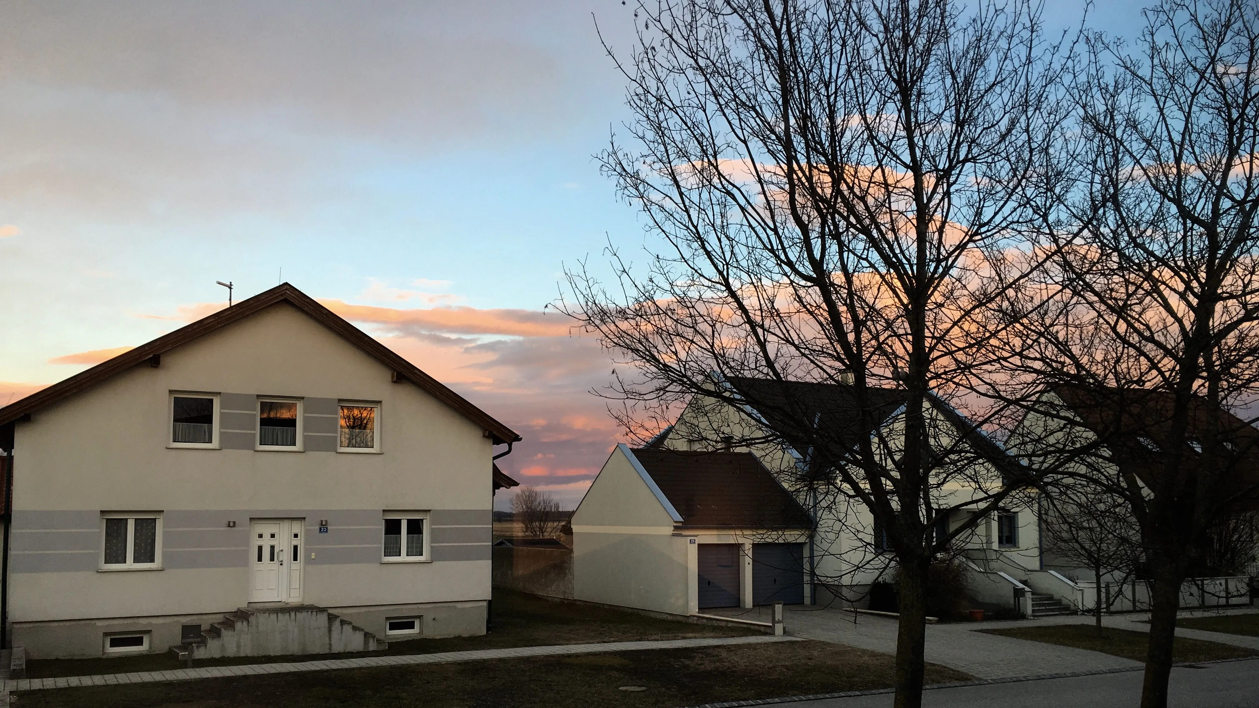 You certainly had some very nice lighting effects in the clouds. These views are so fleeting that a few minutes can mean the difference between spectacular and so-so.This is not one of my usual sunset photos. I was busy until 4 PM today, and when I came home, I was too tired to visit "my" typical place for sunsets. I looked out my living room window (eastwards), and that's what I found:
