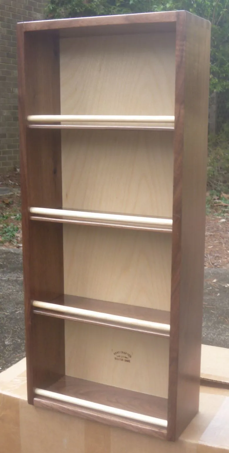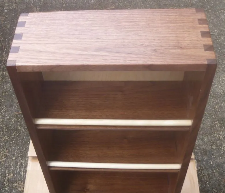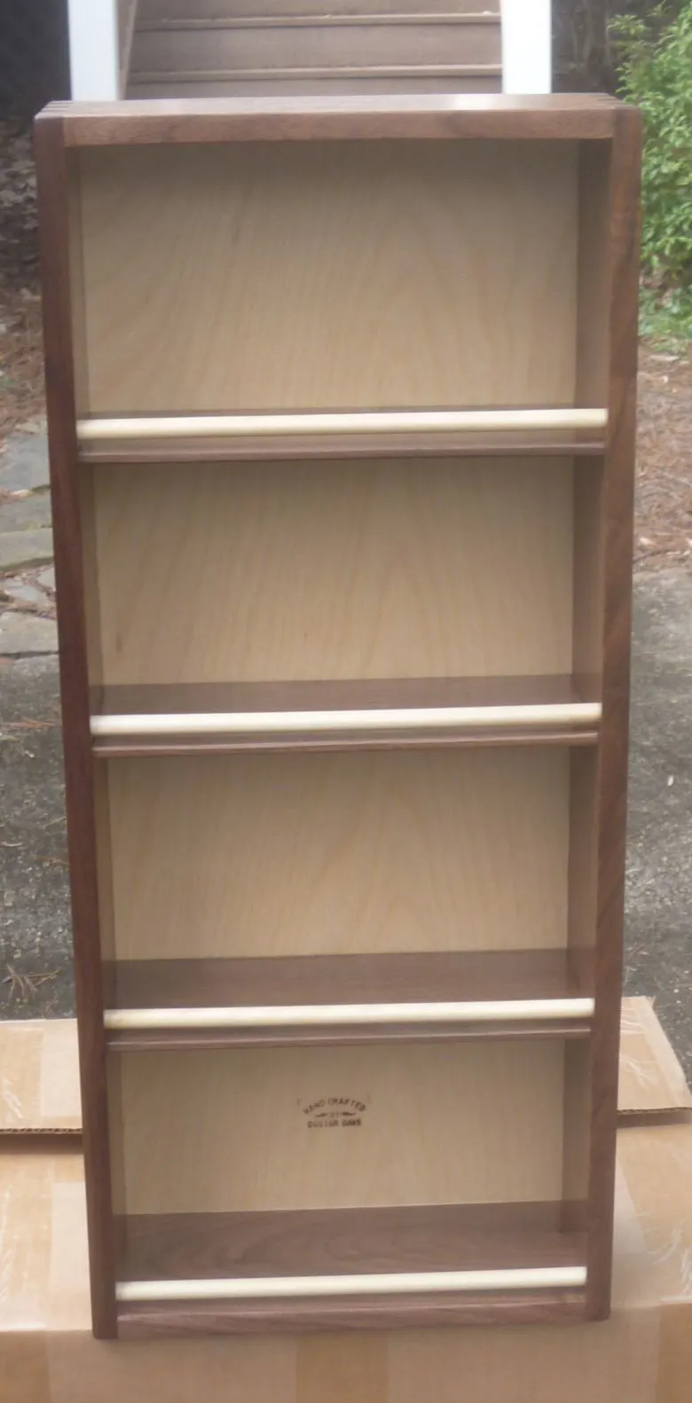 The workmanship is very good. I expect you'll soon be busy making Susan one.Well, a few years back, one of my former radiology residents left some walnut (he was learning woodworking and we did a few projects) behind in my workshop, so I said let's split the 'small' pile and I'll make you a spice rack - results just done and shown below - walnut w/ a birch plywood back (my little brand @ the bottom, i.e. Handcrafted by Doctor Dave) and birch dowels - used finger joints - made a similar one for our kitchen from oak years ago, but the joinery is less attractive - NOW, I may have to do another after Susan saw the walnut one -Dave