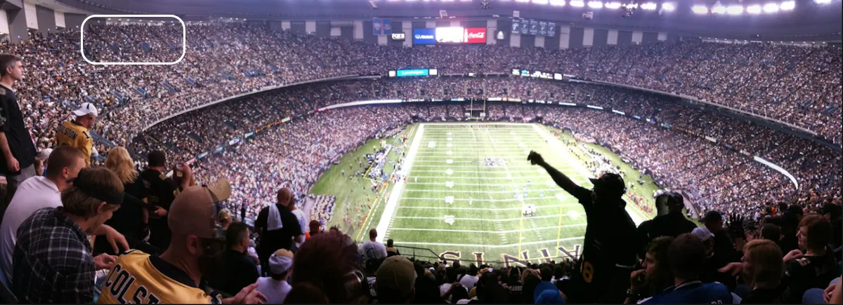 I watched a rugby match at Wembley Stadium in London and had seats that were just as "atmospheric" as yours in the Superdome.Boy, I've not been to a sports arena in ages! The largest was the uncovered football stadium at the University of Michigan (Ann Arbor, MI) when I was in school. The last likely the New Orleans Superdome years ago when my son was a teenager who loved Joe Montana of the San Francisco 49s - we did a short vacation to New Orleans and saw the Saints and 49s play in that large structure - the players looked like 'toy soldiers' from our stratospheric seats (see image below - we were someplace w/i the white oval)!Dave
