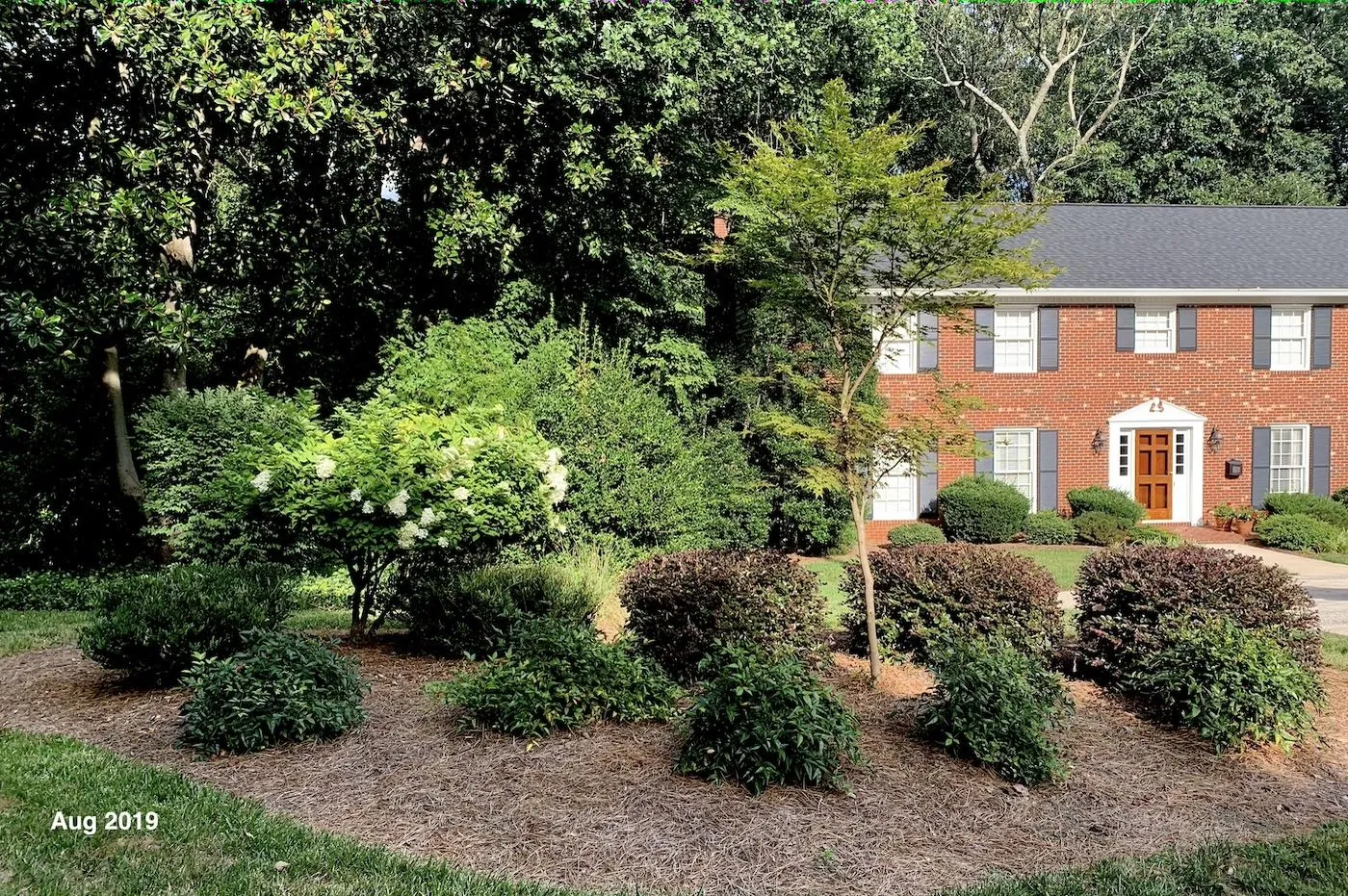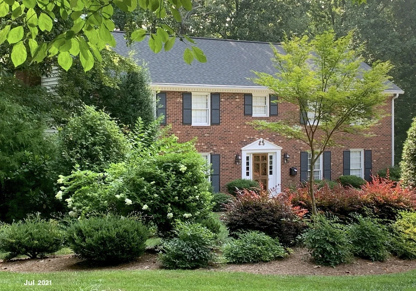 Japanese Maple in Our Front Island - first pic below from 2 years ago (neighbor's house) - next 2 pics from today (sun's angle caused some haze; second pic from a different angle). Again, this was a 'baby' from out big maple in the back transplanted to the front when only about 3-4 ft high; now I cannot get my hand around the trunk - taller and filling out nicely.Dave