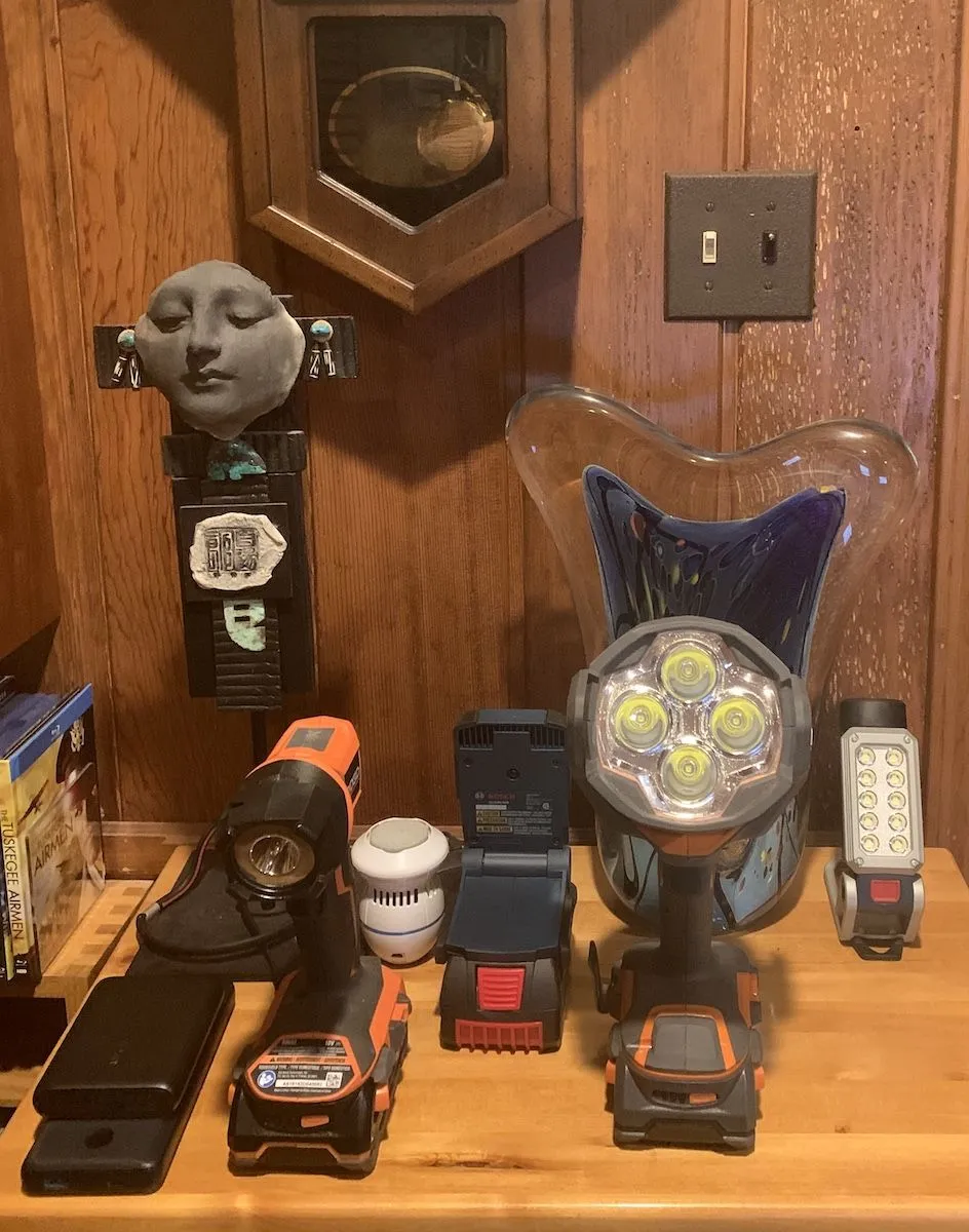 Our second snow already! First pic below from my front door again, about 2" of snow at the moment, but ice and winds are coming so I suspect a power outage - second pic shows half of my lights (all LEDs) w/ charged batteries, also have spare batteries - we'll have battery lights, hot water, battery radio, gas stove top, and internet for a while (will then try a 'hot spot' on my iPhone, if needed). Well, our first snow a few weeks ago was wimpy but this one will not be the same. Dave