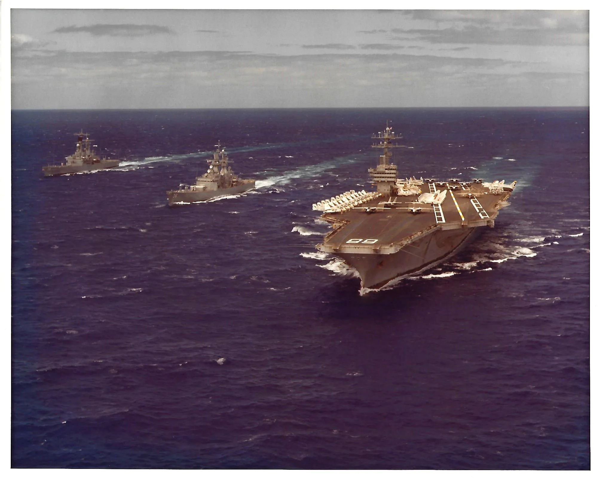 In my early Navy days, we did not have the cool little remote control aerial drones we have today. A photographer would go up in a helicopter with a camera to get the needed aerial shots. I had the pleasure of doing just that several times while stationed on the USS Nimitz to get shots of the battle group, ports of call, and other assorted jobs requested by command and other departments. I was able to keep many of my aerial shots like the one I am sharing with you today. I went up in one of the SH-3 Sea King helicopters for all the aerial shots I took, including this one of the Nimitz battle group, while we were deployed in the Mediterranean Sea. I am glad I had the great job of being a Navy Photographer. It was one of the best jobs you could have, and you got to do, and see a lot of things the regular sailor could never even dream of.