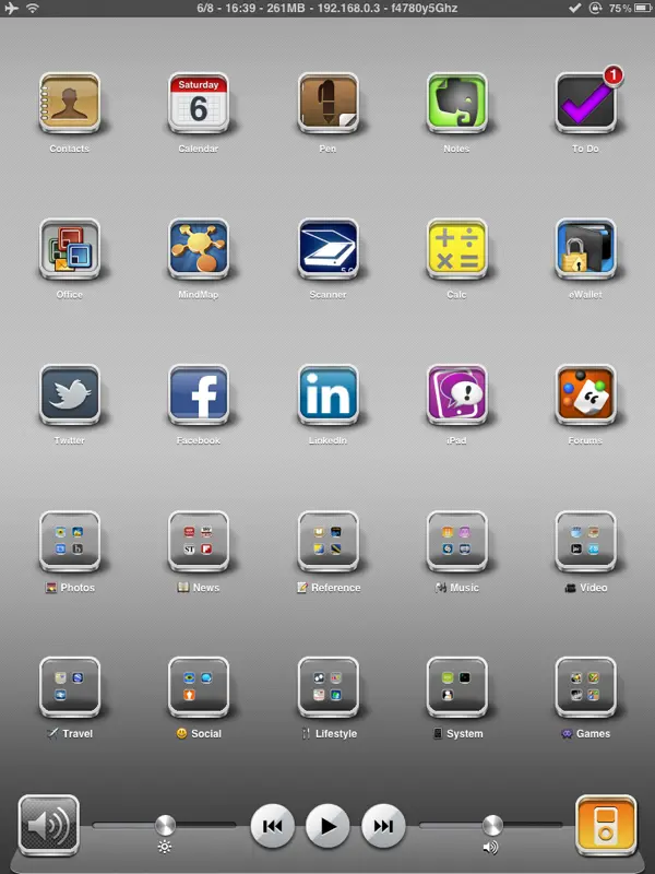 When compard to some of the other themes, this theme is very subtle. In fact, it looks very similar to the stock iPad. However, take a closer look at the icons. Aren't they beautemous? That is some serious detail! I've always like borders on the icons and these are some of the best I've seen. In addtion, the work done to have the mirroring on the dock is first class.