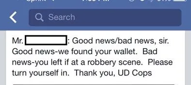 A similar incident actually happened in Arizona. A man went into a McDonald's and placed an order. When the cashier opened the cash drawer, he produced a gun and demanded that the contents of the register be put in a bag. After taking the money he leaves and in his rush to leave the store he forgets to grab his wallet off the counter. The wallet contained his drivers license with his current address. Needless to say the police were waiting for him to return home....