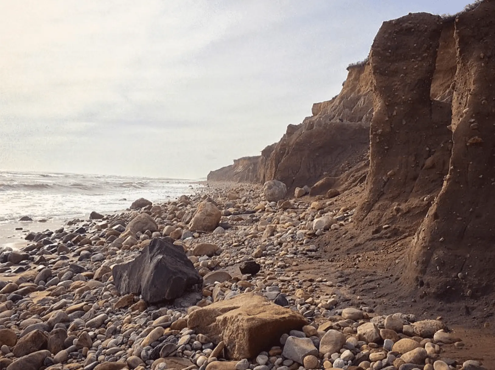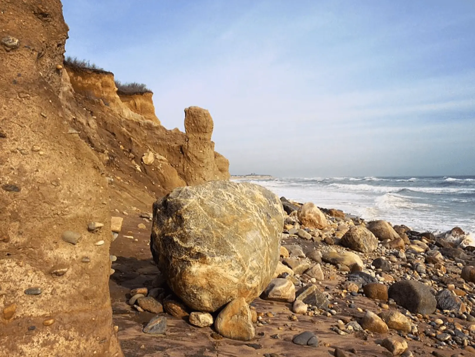 There are a number of New York State Parks on Long Island w/ several in the Montauk area - one of the newest ones is Shadmoor State Park (see map & first quote below), designated in the year 2000; now year's ago I was walking along the Atlantic Ocean beach where the park is now located, but was private property then. Yesterday, my BIL shared a post of a local friend w/ some pics of the beach/park (three shown below) - what is fascinating is that many of the stones/boulders/objects stuck in the bluffs are leftover from the last ice age as glaciers were receding and leaving all of this debris (second quote from a NY Times article in 2000 when the park was established).