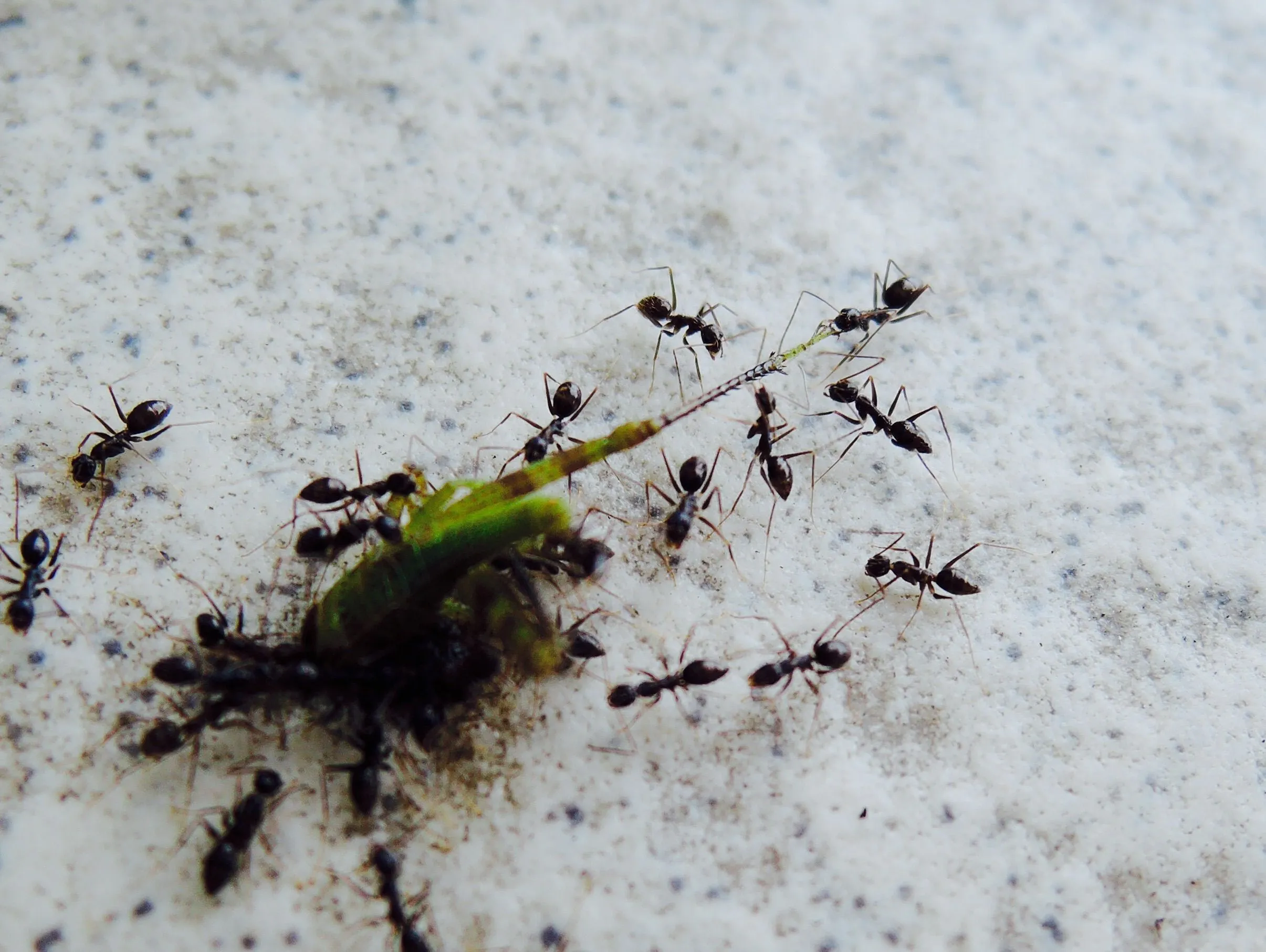 Looks like a grasshopper met his end.My choice - teamwork, this is our dinner.