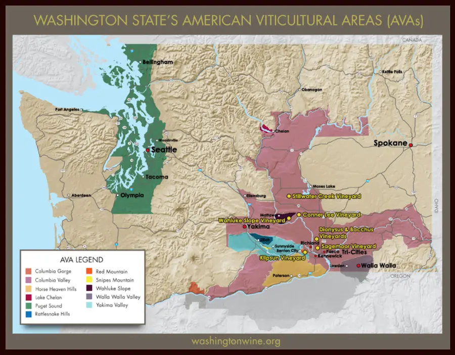 Now, I've been to the Seattle-Victoria-Vancouver area 3-4 times, but never to the eastern part of Washington State - after a trip to Oregon years ago (in part to visit the wineries and drink Pinot Noir), I wanted to fly into Spokane, rent a car, and then head southwest to some of the main wine growing areas of the state and the adjacent Columbia River valley - nearly all of the wine made in Washington comes from those southeastern portions of the state (as shown on the map) - just too wet & cool west of the Cascade Mountains, although a GREAT area to visit!