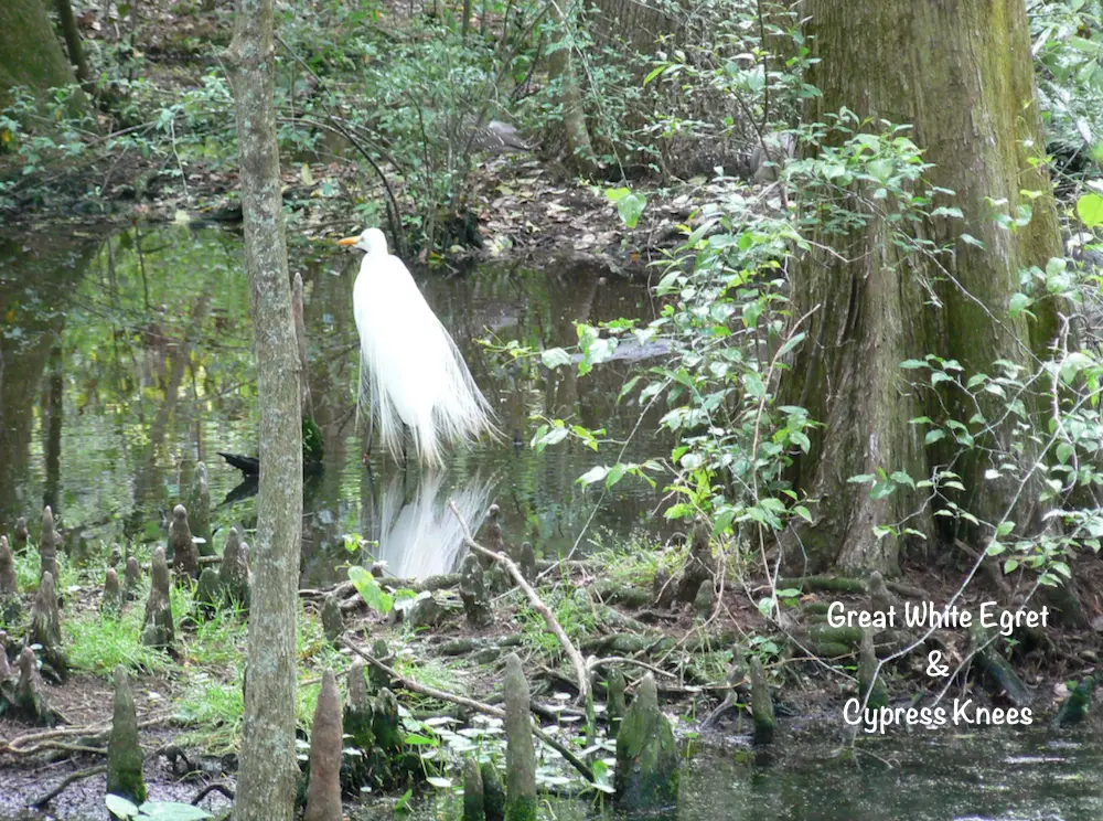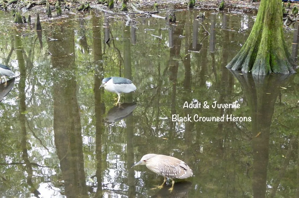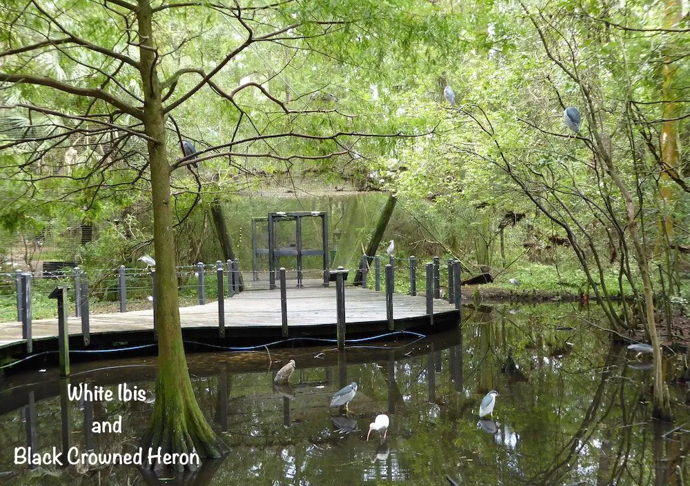 Lowcountry Trail, a short stroll enters the zoo area w/ all of the attractions listed in the title of this post. First, domesticated animals (horses, sheep, bulls, etc.) are there - then the boardwalk trail leads to the enclosed Aviary (see first pic of schematic map) - the water fowl are in the water, on the rails, and up in the trees (I wore a hat - others wandering through were hit on the head -