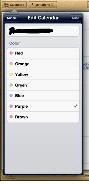 Select the Calendar button at the top left. Tap the Edit button. Select the calendar you want to change the color, select your color, and Done.