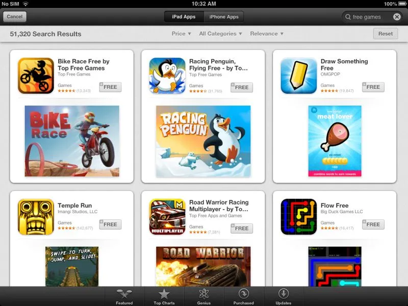 Yes i did it!!Iwent to free games and displayed about 56000 games!!The flag on apple id and country/region was united states!!I think i m doing wron with the search key words!!Can you tell me how i will potimize the search!!For example i wrote free utillities and displayed about 890 utilities!!Go up to the Search Tab (top right) and input free games then press Search on your keyboard
