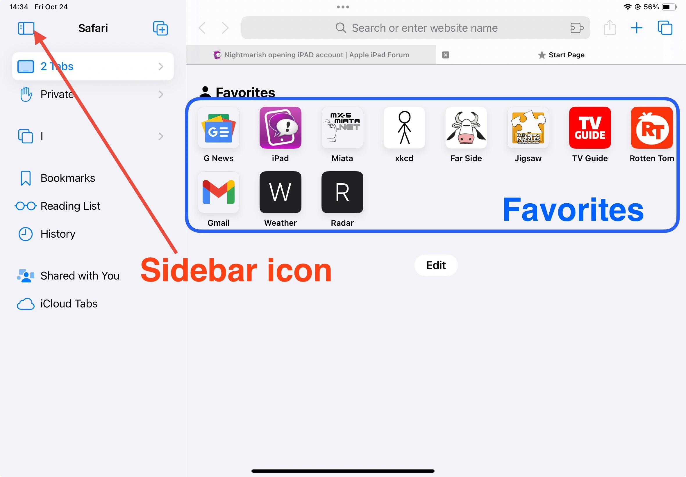 Your Safari screen is totally different . Definitely, there is no sidebar icon like the one with the red arrow. I'd ike to send you a screenshot of mine, but only I know how to do it from Windows. I'll see if I can find the info on the Web, , not from iPAD I'll see if can get info on the Web because I don't want you to waste your time. You have already been very helpful. If I cannot get it, I'll ask for your help. I just revised my post.Sorry, by Home Screen above I meant the Safari Start Page.
