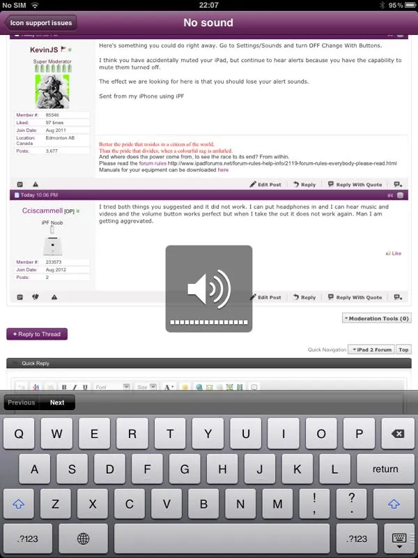 Hello, I have IPad 2 and for some reason I can hear no sound when playing videos that I have on my IPad or YouTube or any other video. When I try to turn volume up with the switch on the side it says sound effects and does not turn volume up. I can hear the face time alerts and all the ringtones and so fourth but can not on the videos. Just wandering if anyone could help me or if I needed to send it for repair. Thanks.