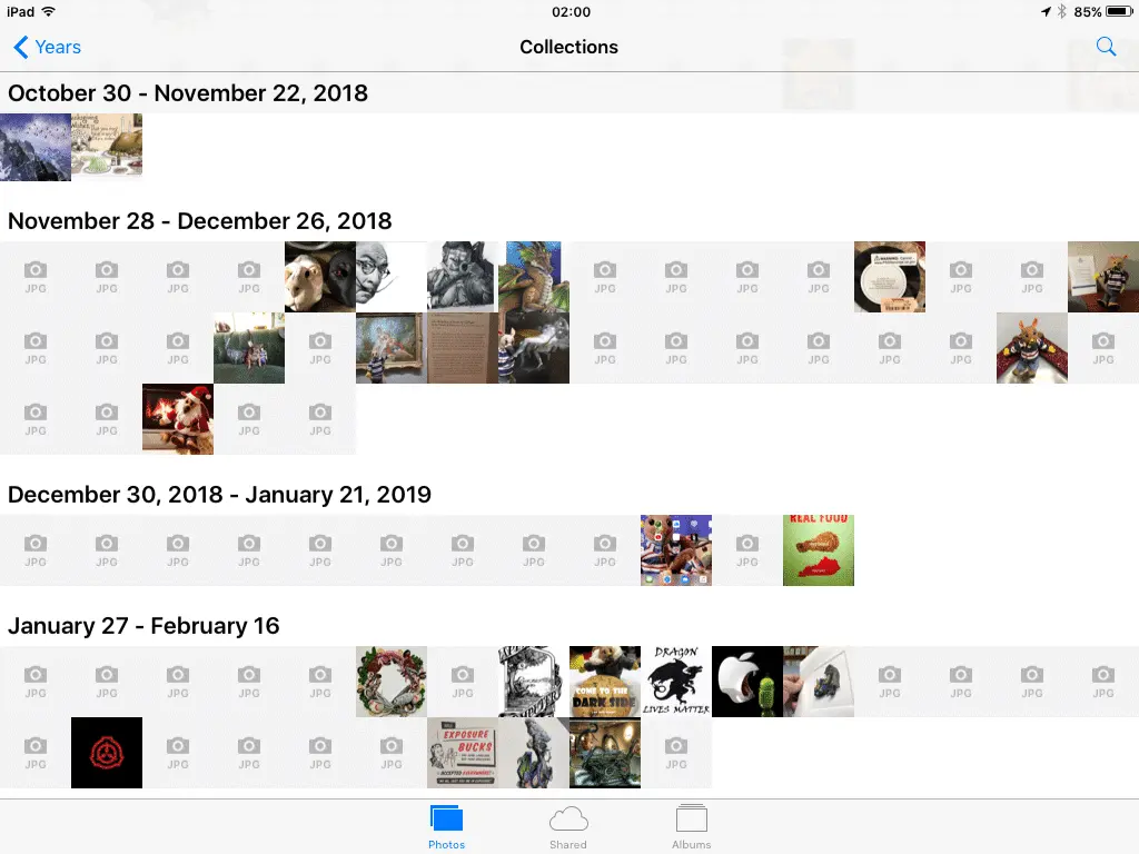 I have roughly 160 photos righ now in my iCloud account, and on the iPad the majority do not display a proper thumbnail, only the white square with the little camera and jpg. Emblem. If I tap the square the image appears perfectly, but I can't always edit it or share it . I generally only have full functionality on those images I save from texts or emails. Looking at the iCloud info in settings credits me with 40 photos. Scrolling to the bottom of the photo album gives me a message downloading 115 photos.... This has never changed. Apple tech support told me this was an issue because the iOS on this iPad 2 is older than my iPhoneX and they can't really sync as well as if everyone had iOS 12. Not a huge issue because I generally just grab the phone to text images that refuse to cooperate on the iPad....But I was just curious if anyone else has encountered this. Other than that the iPad is perfect, if a bit slower than it's newer playmate. Ironically my Windows 8.1 desktop cooperates perfectly( can't text, duh..but sharing is amazing), and seamlessly with everyone involved....cool!. Should I be concerned or just plan on hacking up $300 or so for a new one, and move on ( I really kind of want one, purrrr). L